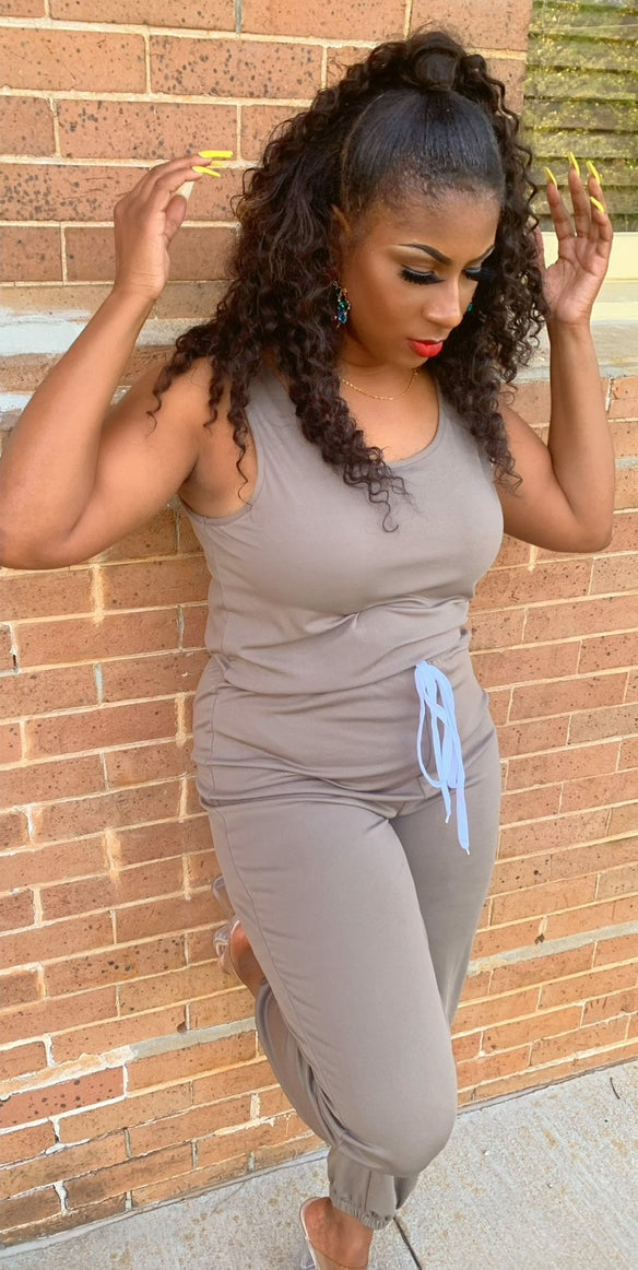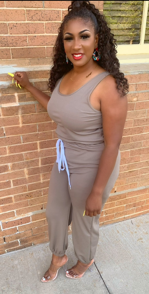 This effortless one-piece jumper is designed for comfort without sacrificing style. Featuring a soft, sleeveless tank-style top and relaxed jogger-style legs with an adjustable drawstring waist, it offers a flattering fit that moves with you. Lightweight with just the right amount of stretch, this jumper is perfect for casual days, weekend outings, or dressing up with heels and statement accessories.