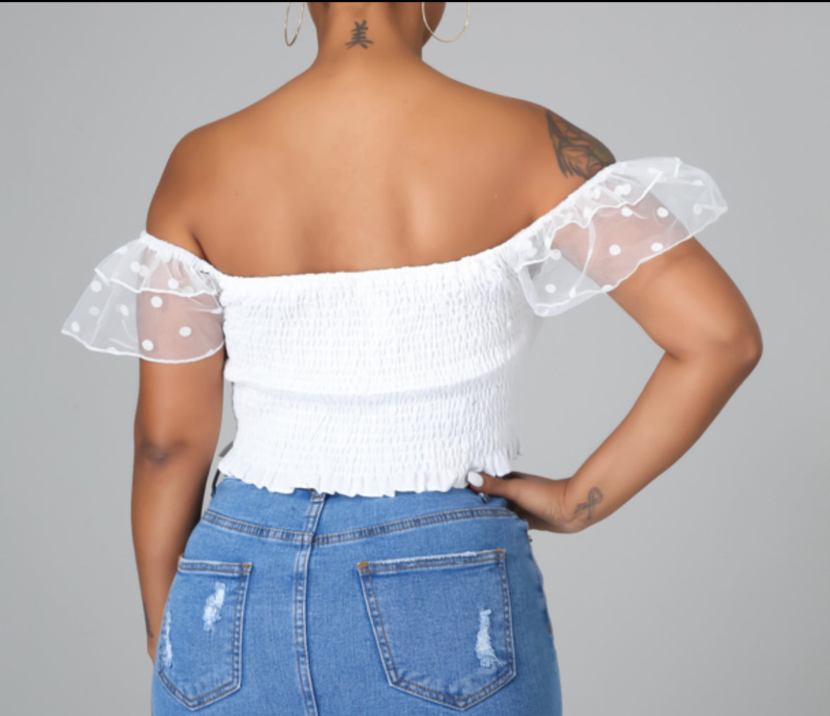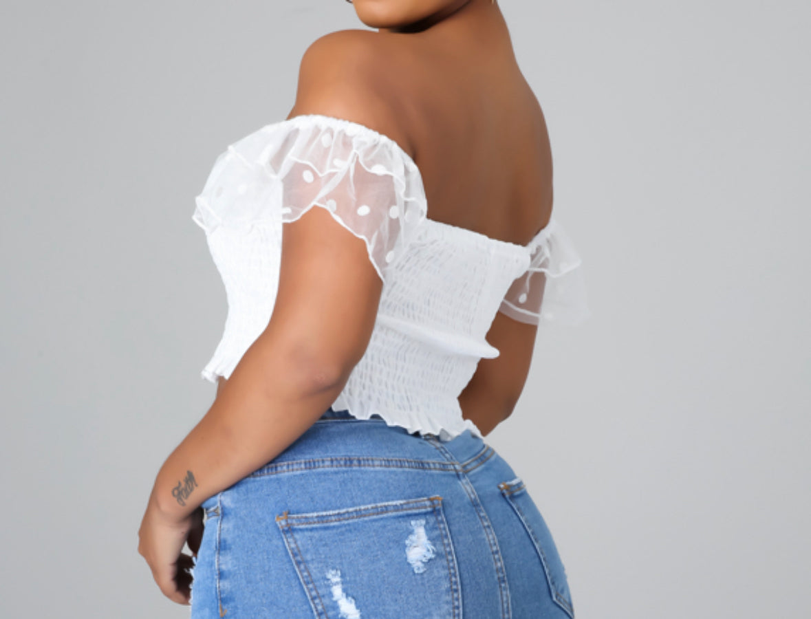 Soft, flirty, and effortlessly pretty. This Smocked Top features an off-the-shoulder neckline with delicate sheer ruffle sleeves and a fully smocked bodice that stretches for a comfortable, flattering fit. Lightweight and easy to style, this top pairs beautifully with denim for a polished daytime look or dressed-up casual moments.